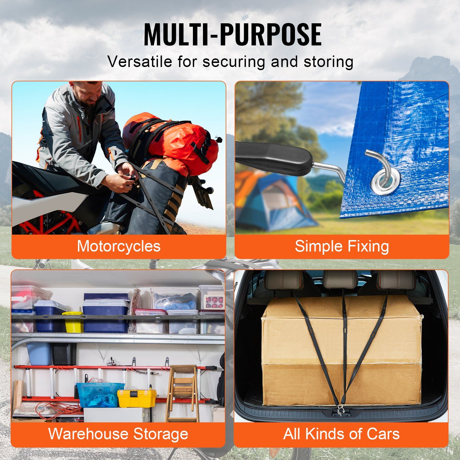 Featuring ultra-long stretch bungee straps, these are perfect for accommodating items of various shapes and sizes. They are essential for easy storage and secure transport.