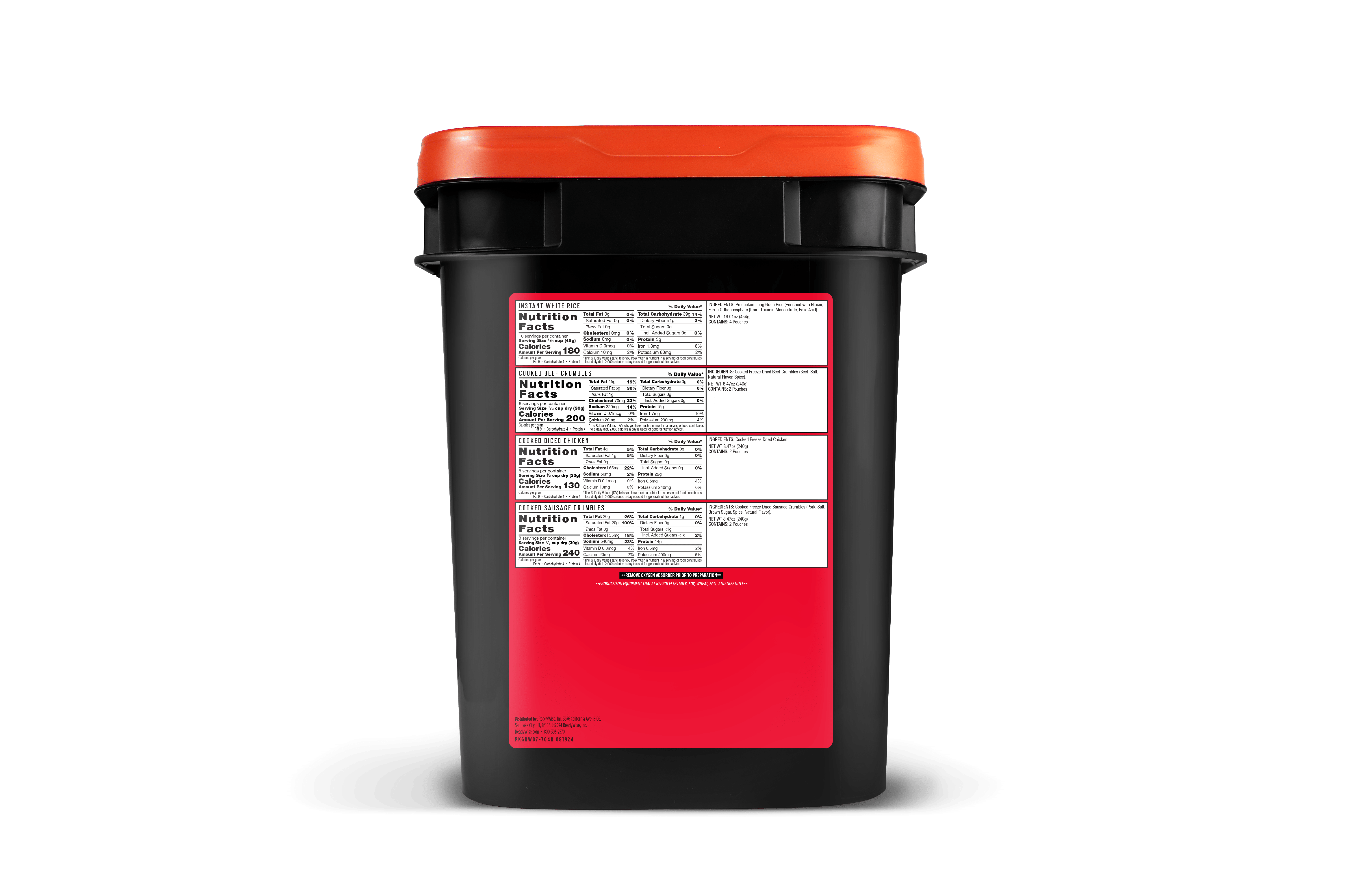 Contents 40 Servings Instant White Rice – 4 10/Serving pouches 16 Servings Beef Crumbles – 2 8/Serving pouches, 240g total 16 Servings Diced Chicken – 2 8/Serving pouches, 240g total 16 Servings Sausage Crumbles – 2 8/Serving pouches, 240g total