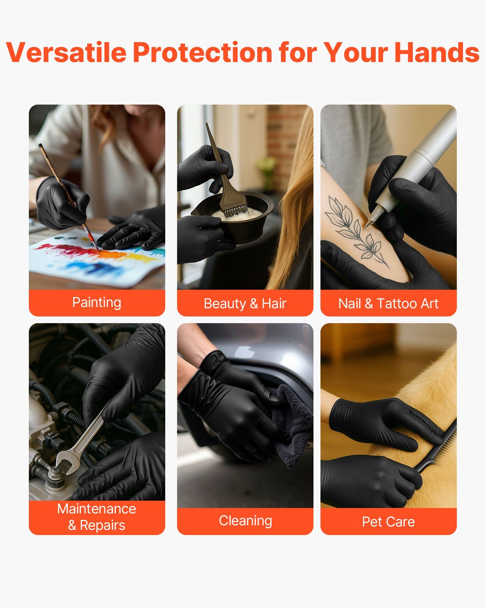 5.Wide Application: These disposable gloves are ideal for cleaners, tattoo artists, beauty salons, gardening, hair coloring, painting, pet care, food preparation, home improvement, and medical lab work